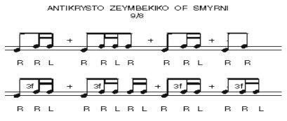 But the most interesting version of all, in my opinion, is the "Antikrysto Zeymbekiko of Smyrni" [a dance for couples in which the man used to dance opposite (Greek word=antikry, turkish word=karsh, like karshlama)]. The city of Smyrni on the coasts of Minor Asia (today's Turkish name is Ismir) and many other towns and villages in that area were residential parts mostly of Greeks till 1922, who were persecuted or slaughtered by the Turkish army, that finally ruined the area putting fires on. The songs and the rhythms the refugees brought with became the basis for the Rembetika songs and also for the latest Greek popular music, while they are being sung nowdays and the most possible is to be sung for long. The well-known song "Misserlu" is of Minor Asia origin of the 19th century (at least people says so here) and it has been recorded in a lot of versions by Greek musicians. A typical band in Smyrni, except for the doumbec, had also the violin, santouri, outi (oud), canonaki (canoon) or mandolin. The rhythm Antikrysto Zeymbekiko of Smyrni goes like this (where 3f mean a quick successive stroke of the ring finger, middle finger and index finger of the left hand on the membrane):