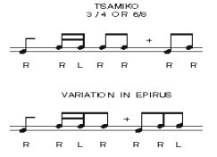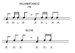 About the rhythms now: the kalamatiano, as you mention, is played at music nightclubs and it is used to colour particular points, but one cannot dancing like this [sic], because each rhythm is written for the dancer's step especially in row dances. [Jas: here I think Manthos means that, although this rhythm is written in 7 beats, it is played with wide variation of timing to "fit" the dance or melodic piece that is being performed.] The traditional execution is this one: