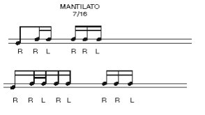 It is of a great interest to observe the geography of music in the Mediterranean countries. In Thrace, in the South coasts of the Black Sea and in the area of Trapezounta (today's Turkish name Trabzon) where a lot of Greek people used to live until 1922, there's a rhythm of 7/8 or 7/16 that is called Mantilatos. (Mandilia=handcerchiefs). The dancers in order to perform it waved handkerchiefs in the air. It goes like this: